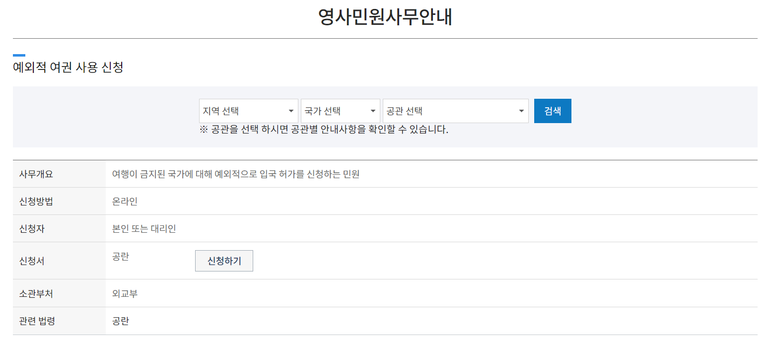 예외적 여권사용허가 신청 바로가기 (영사민원24 홈페이지 또는 이메일 접수 - 하단 안내 참조)