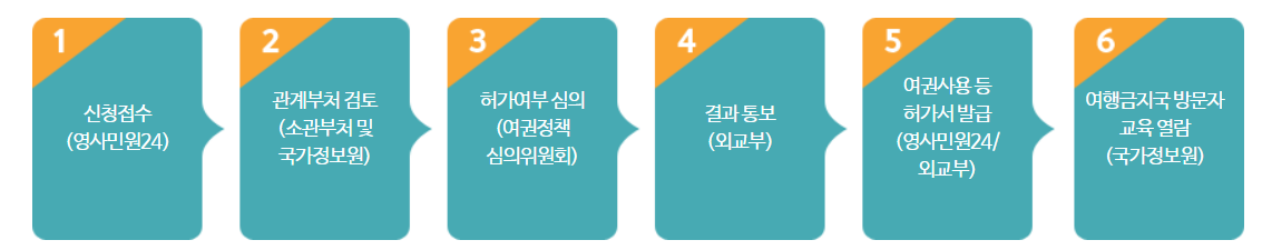 1. 신청접수 - 2. 관계부처 검토 - 3. 허가 여부 심의 - 4. 결과 통보(외교부) - 5. 여권사용 등 허가서 발급 순으로 허가 진행됨. 이후 여행금지국 방문자 교육(국가정보원 교육) 열람 절차까지 완료돼야 출국가능