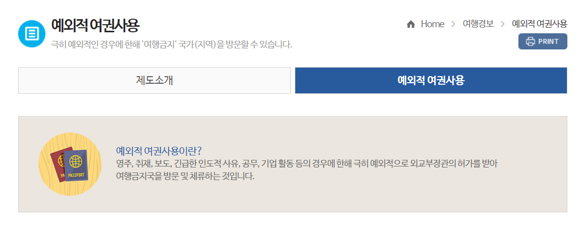 외교부에서는 여권법 제17조 제1항에 따라 국외 위난상황으로 인해 국민의 생명 신체 재산을 보호하기 위해 특정 국가 지역 방문을 중지할 수 있으며 이때는 외교부 장관이 긴급한 인도적 사유(개인적사유포함) 인경우 취재-보도와 같은 특별한 사유에 한해 여권 사용 및 방문-체류를 허가할 수 있습니다.